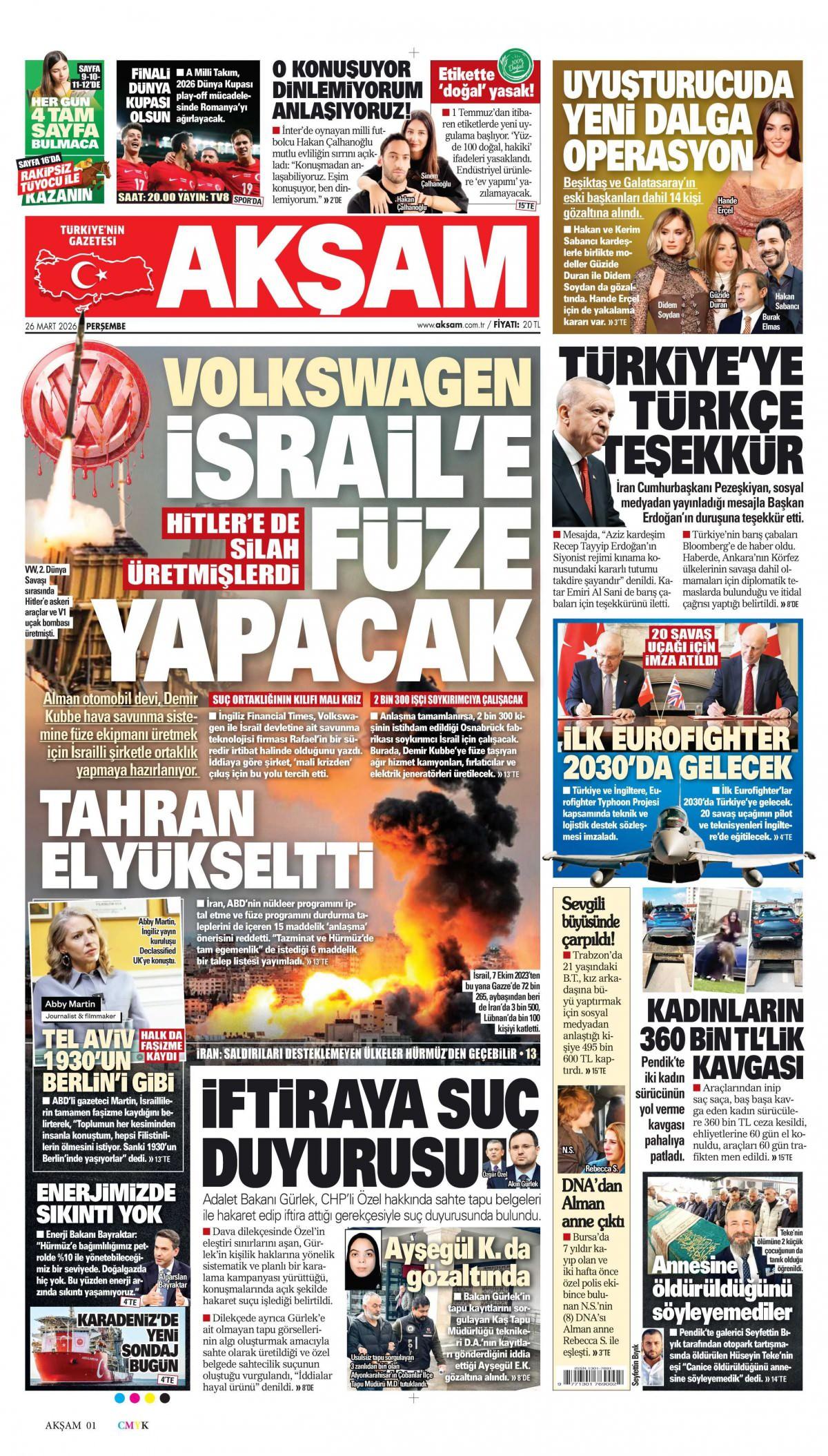 Akşam Gazetesi 27 Mart 2026 Günü Manşeti
